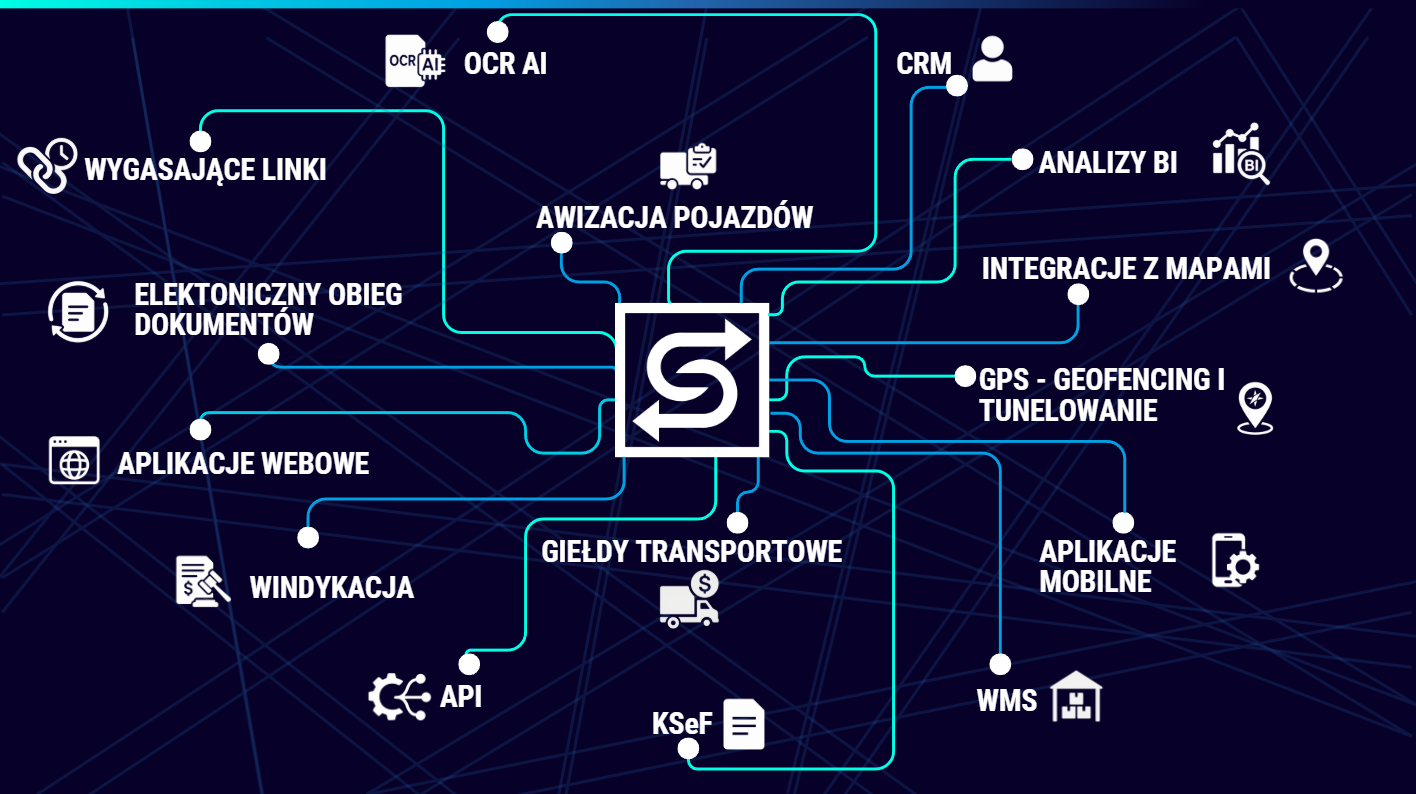 - Automatyczne przyjmowanie, przetwarzanie i monitorowanie zleceń transportowych.